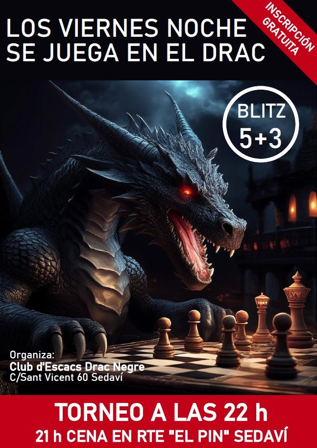 El Blitz Nocturno Drac Negre de los viernes es un evento semanal organizado por el Club d’Escacs Drac Negre para disfrutar de una noche de ajedrez en Sedaví (Valencia).